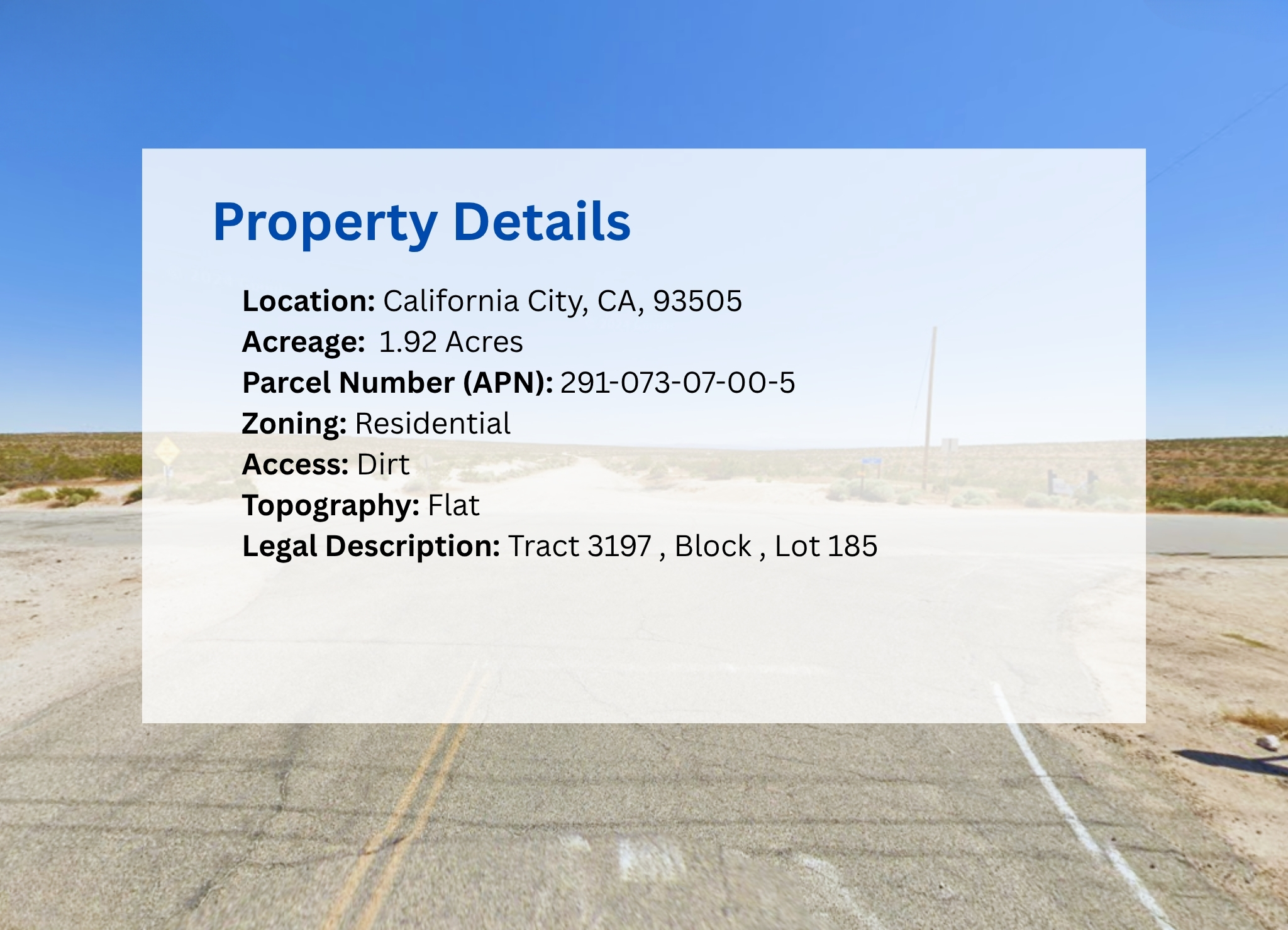 Own nearly 2 acres of opportunity! This affordable, flat corner lot offers space, privacy, and endless potential. Zoned R-4, it gives you the flexibility to build a home, create your own desert camp, bring your toys or horses, or simply hold as a smart long-term investment. Even better, annual property taxes are just $8.65.